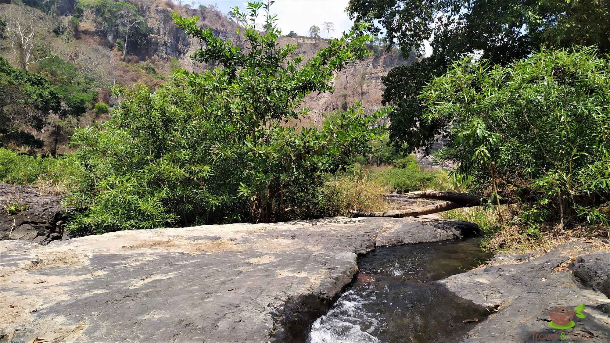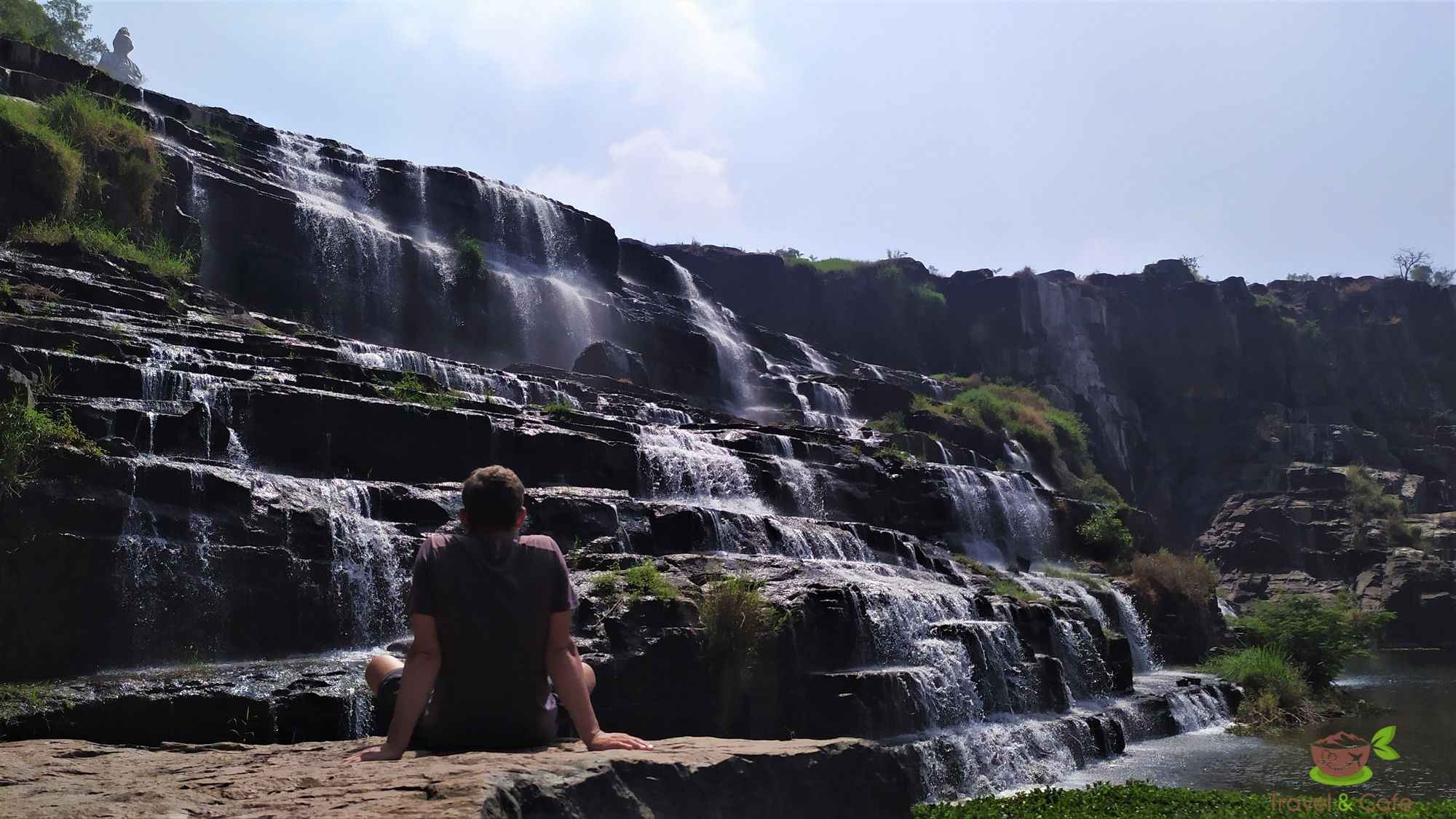 W okolicy znajduje się jeszcze jeden wodospad. Tu również został stworzony cały kompleks, w którym znajduje się ogród, kawiarnie, toalety i główna atrakcja czyli wodospad Pongour Falls. To kilkuwarstwowy, szeroki wodospad położony jakby w kanionie. U jego szczytu znajduje się statuetka bogini. Otoczony jest zielonymi drzewami między którymi płynie rzeka. Siadamy na skale bezpośrednio przed strumieniami spływającej wody. Przyjemny szum wodospadu zagłusza myśli, lekka bryza muska ciało, które rozgrzewają promienie słońca, aż pot z pleców spływa 😉 Ach jak przyjemnie. Bezchmurne niebo rozjaśniło mrok panujący w dniu wczorajszym i na chwilę zapominam o tym czymś co wisi w powietrzu. Kiedy słońce pali w twarz i zbiera się grupa (nielicznych już) turystów, przenosimy się w bardziej odległe miejsce gdzie woda płynie wąskim strumykiem. Siedząc na kamieniu moczymy stópki. I tak w ciszy, skupieni na przepływającej wodzie ukoiliśmy swoje zmysły.