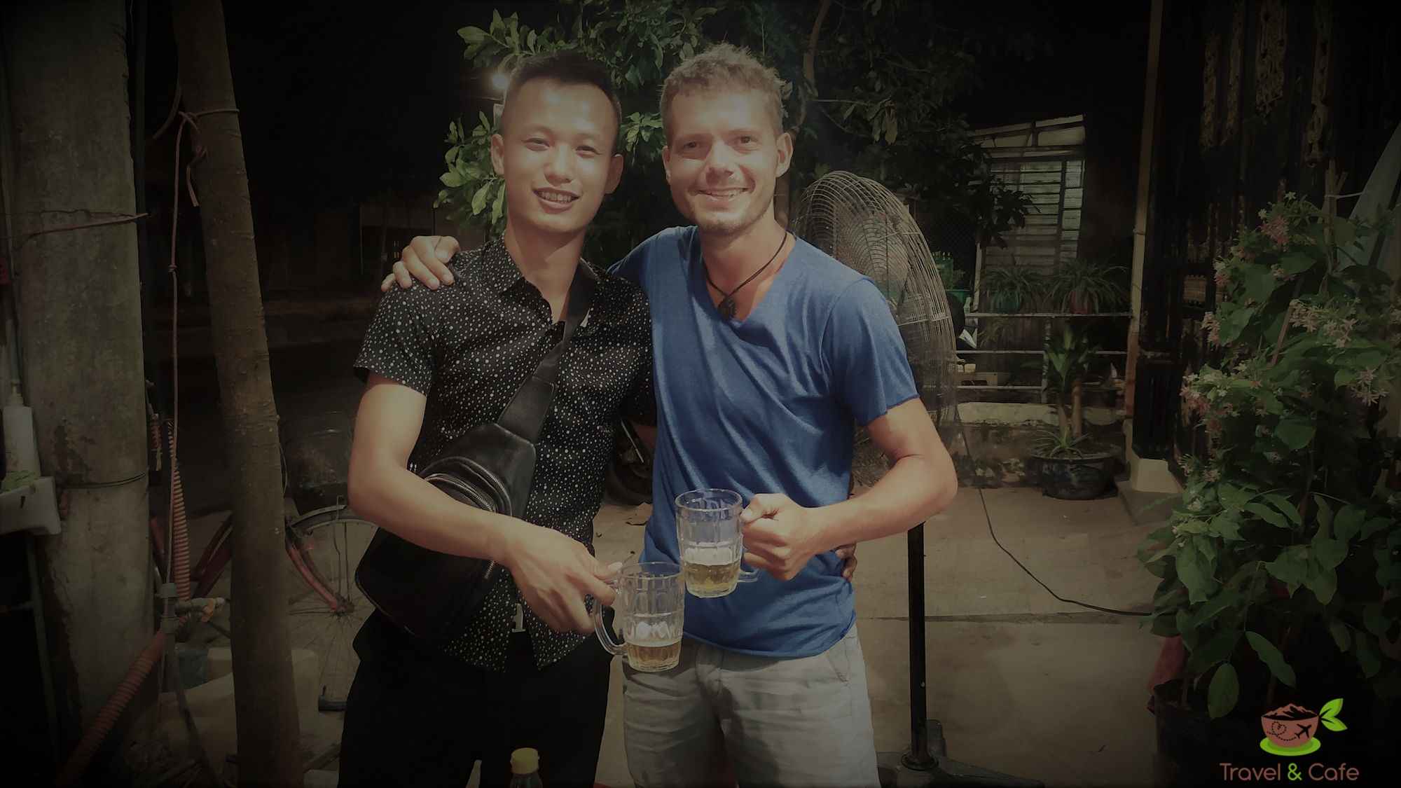 Dzień postanawiamy, wyjątkowo tym razem, zakończyć lanym piwkiem. Nie śpieszy nam się do ciemnego, hotelowego pokoju. Przed naszym hotelem (to chyba jedyny plus tego hotelu) znajdują się dwie knajpki, które serwują bia hơi czyli świeże lane piwo, popularne w północnym Wietnamie. W knajpach biesiaduje już sporo miejscowych. Wybieramy tą w której jest mniej osób aby jak to Sebastian określił nie było picia na ex... Tym razem nawet nie musimy mówić co chcemy bo od razu dwa kufle lądują przed nami na stoliku, właściciel tylko pokazuje duży plastikowy dzbanek, chwila wahania i kiwamy ok, niech będzie...2 litry piwka. I zanim dostaliśmy piwo na stół już słyszymy, że ktoś do nas zagaduje... Odwracam się i widzę jak młody mężczyzna trzyma kufel i chce się „stuknąć”. Tłumacz google jest naszym niezbędnikiem w Wietnamie... I tym razem również korzystamy z jego wsparcia. Przy stoliku obok odbywa się spotkanie urodzinowe. Kilku młodych chłopaków świętuje urodziny jednego z kolegów. Składamy życzenia, przypijamy, stukamy się kuflami kilka razy (Wietnamczycy lubią się stukać kuflami przed każdym łykiem piwa) i pada hasło „do dna”. Ja odmawiam ale za to Sebastian musi wypić. Co oni mają z tym piciem do dna? To już drugi raz w tym dniu Sebastian pije do dna ;) Śmiejemy się jeszcze, dziękujemy za pogawędkę i przy misce moczonych orzechów dopijamy świeże zimne piwko prosto z kegi.