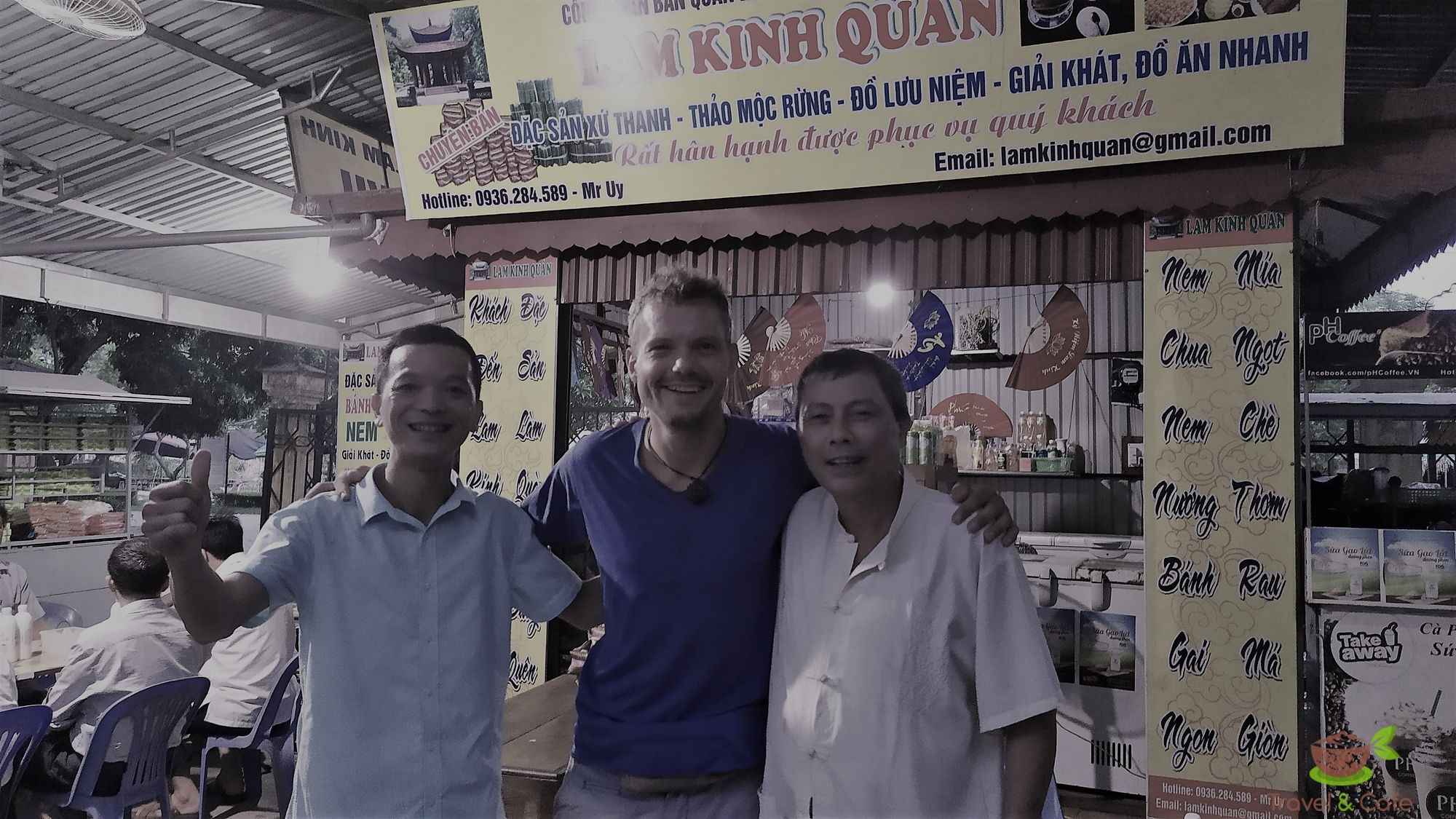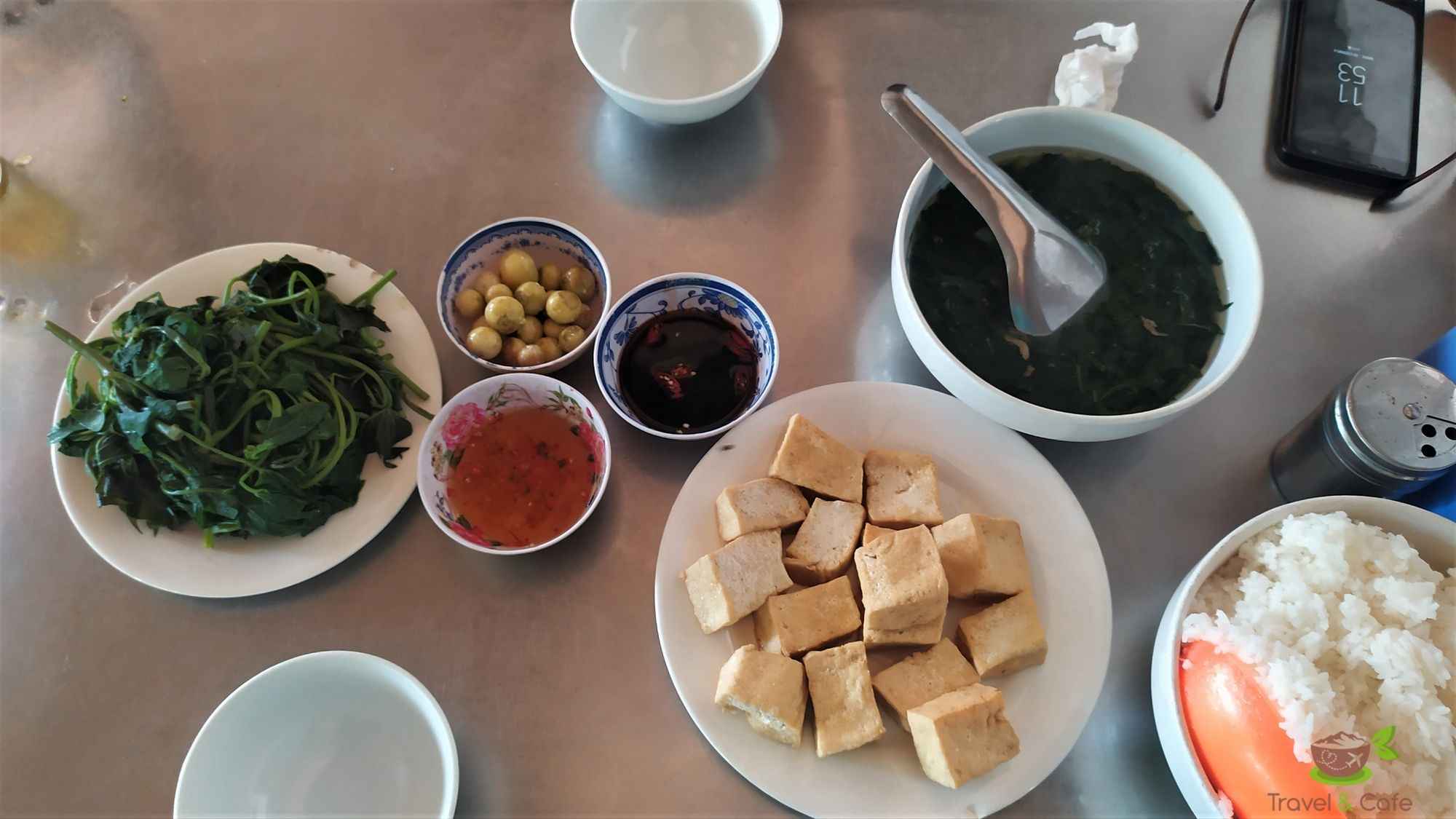 Gdzie zjemy obiad? W miejscowości Tân Kỳ. Mamy więc do pokonania 90 km. W Tan Ky powinniśmy być dokładnie w porze obiadu. Łatwą, otoczoną polami z jednej strony i górami z drugiej strony, trasę pokonujemy w 1 godzinę 50 minut. Mijamy pola ryżowe, plantacje herbaty, pola uprawne, farmę mleczną Vinamilk i wjeżdżamy do największej prowincji Wietnamu Nghe An. W Tan Ky jesteśmy o 11:30. Idealnie! Restauracji wegetariańskiej w miasteczku nie ma więc musimy sobie poradzić inaczej. Wchodzimy do jednej z knajpek przy głównej drodze. Przy jednym ze stolików siedzą 3 osoby. Zaskakująco szybko zamawiamy danie bezmięsne. Rau, đậu i cơm czyli warzywa, tofu i ryż to niezawodny zestaw wegetariański, który można dostać niemal w każdej knajpie. Ale jeszcze zanim na dobre usiedliśmy, starszy mężczyzna siedzący przy stoliku obok zaproponował Sebastianowi małe piwko. Nie wypada odmówić. I już po chwili Sebastian popija zimne piwko, a mi leci ślinka. Zaczyna się rozmowa. Mężczyzna przebywał jakiś czas w Niemczech i zna kilka słów. Śmiech towarzyszy nam podczas miłej rozmowy. Czujemy się jak byśmy jedli rodzinny niedzielny obiad tym bardziej, że mamy na stole zupę, ryż, tofu, szpinak i sosy. Niezła uczta. Po chwili knajpka się zapełnia a my jeszcze bardziej czujemy lokalny klimat. Niedzielny obiad w lokalnej wietnamskiej knajpie w towarzystwie miejscowych. Udało się!