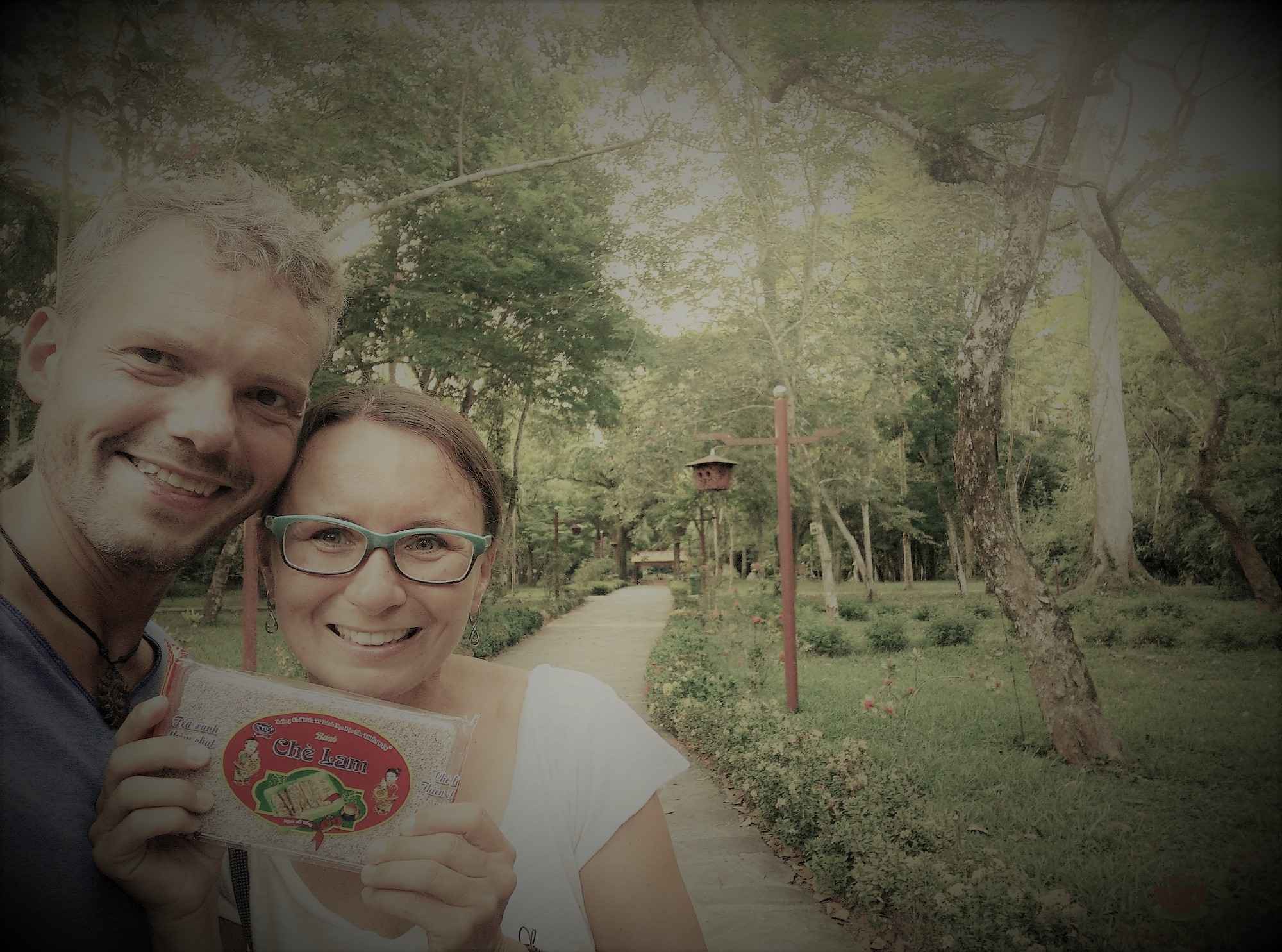 Jedziemy do parku i cesarskiego miasta Lam Kinh, który jest jednocześnie miejscem historycznym. Znajduje się w nim cesarska cytadela, pałac, smoczy dziedziniec i świątynia tajska oraz grobowce królów z dynastii Le. To zabytek związany z życiem i karierą, słynnego w wietnamskiej historii króla Le Thai To oraz z powstaniem wojsk Lam Son w XV wieku. Według map google obiekt historyczny znajdujący się w parku jest czynny do 17:30. Docieramy na miejsce po 18:00 ale widzę otwarte wejście i miejscowych zmierzających do parku na wieczorny, szybki spacer. Podjeżdżamy, uśmiechnięty mężczyzna wskazuje nam abyśmy zaparkowali przy jego knajpce. Obok jest kasa biletowa ale wejście jest bezpłatne. Mijamy kilka punktów z kokosami i wchodzimy parku, spacerujemy uliczkami pomiędzy gęsto rosnącymi drzewami, ptaki swoim głośnym śpiewem umilają nam czas, oglądamy mauzoleum królów, świątynie i kiedy przy jednej z nich zatrzymuję się aby przeczytać informacje umieszczone na tablicy.... dostaję nagle „Che Lam” od mężczyzny, który był na terenie parku. Zaskoczona z uśmiechem przyjmuję prezent. „Che lam” to tradycyjny wietnamski deser pochodzący z północy. Jest przygotowywany z prażonego kleistego ryżu, który jest mielony na drobny proszek przed połączeniem z orzeszkami ziemnymi, imbirem i melasą lub cukrem. Całość miesza się w sposób ciągły, aż do uzyskania konsystencji lepkiego, giętkiego ciasta, które jest następnie spłaszczane i powlekane proszkiem ryżowym. Hmm, tego jeszcze nie próbowaliśmy ;) U nas na pewno się nie zmarnuje i przy ciepłej herbatce, bo tak najlepiej go jeść, skosztujemy tego północno-wietnamskiego przysmaku.