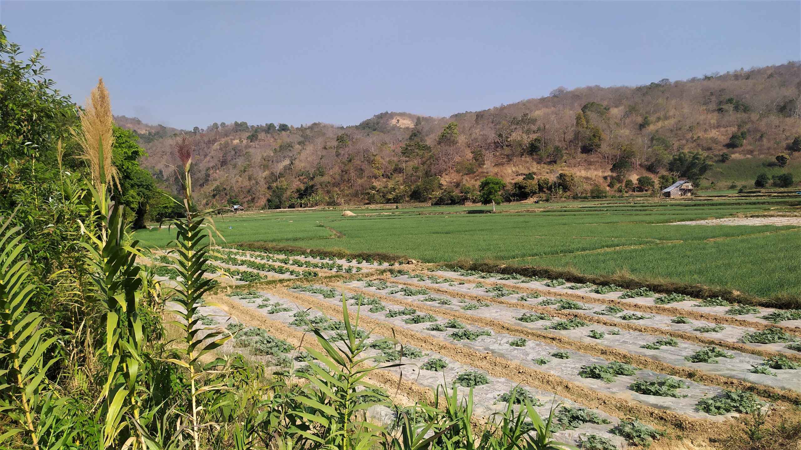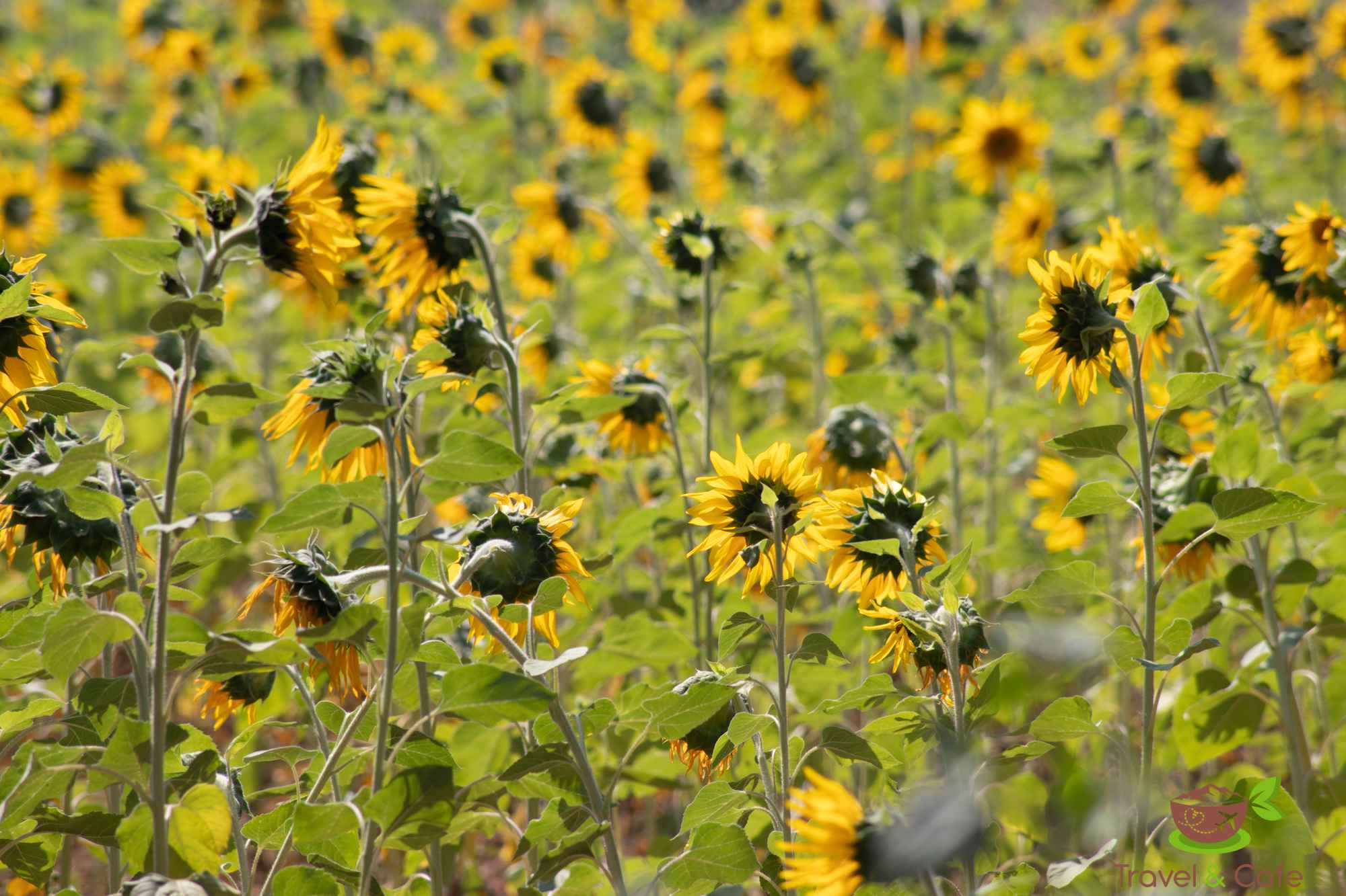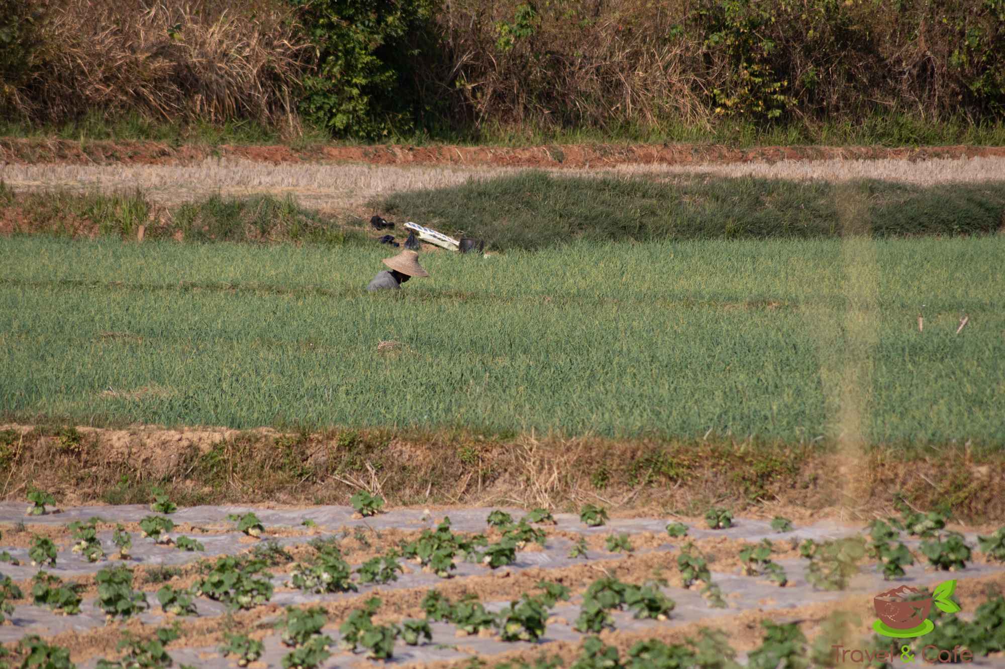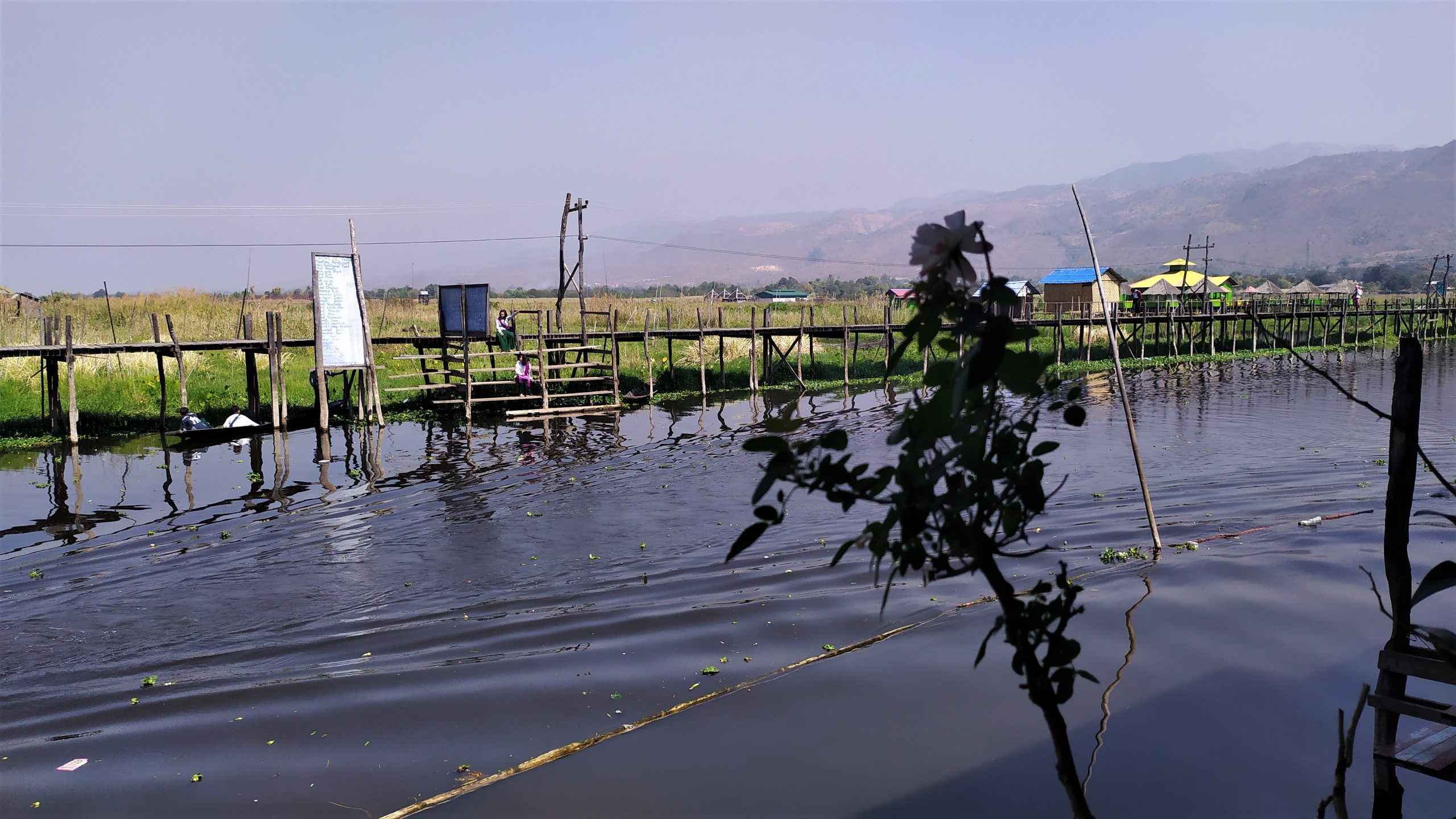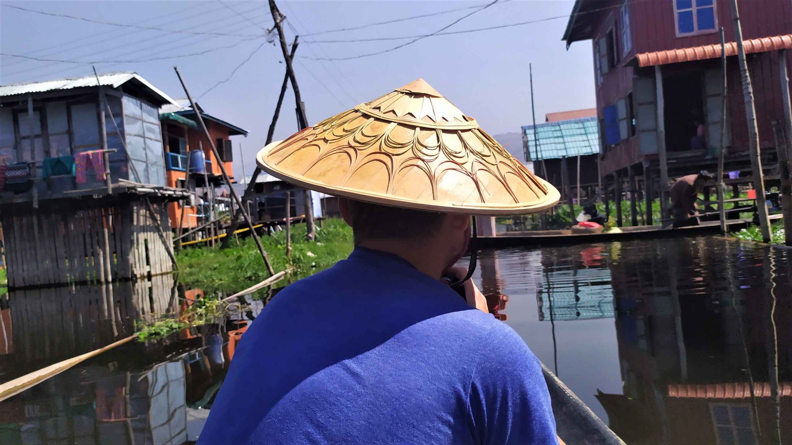 Pierwszy dzień w rejonie Inle. Propozycje wycieczki łódką po jeziorze sypią się z każdej strony. My jednak podejmujemy próbę zobaczenia jeziora Inle nie wykupując wycieczki. Wsiadamy na skuter i w drogę. Jedziemy w kierunku jeziora Moebyel. Przy okazji, co chwilę, zbaczamy z głównej trasy. Pierwsza boczna uliczka i wjeżdżamy pomiędzy pole ryżowe a pole ze słonecznikiem. Na polu ryżowym tylko tradycyjne stożkowe nakrycia głowy wystają zza zielonych roślin. Po chwili stożek wstaje i uśmiechnięta kobieta do nas macha. Nawet w tej chwili się uśmiecham na wspomnienie tego widoku.