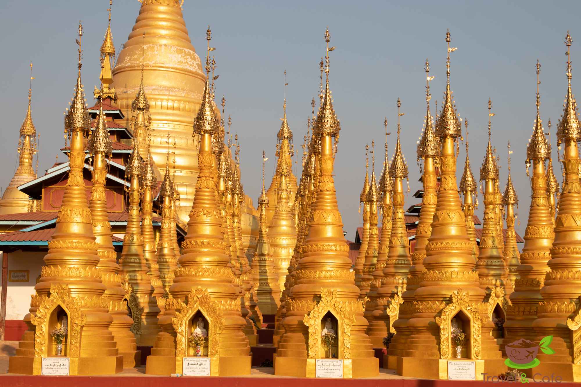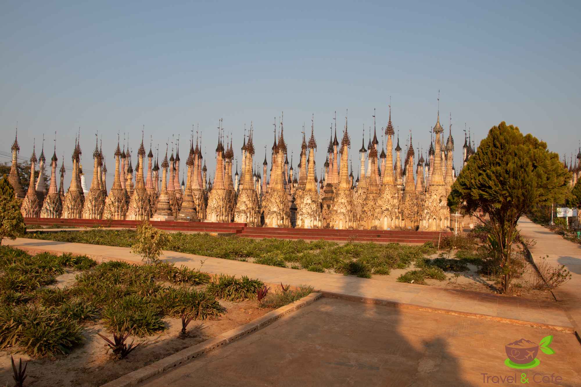 Jedziemy w kierunku kompleksu światynnego Mwe Taw Kakku. Przyjeżdżamy tu jednak zbyt późno. Wstęp kosztuje 3 USD (lub 3 EUR lub 5000 MMK). Nie mamy czasu na dłuższy pobyt na terenie kompleksu, mimo, iż bardzo byśmy chcieli. Liczne małe pagody tworzą niezwykły widok, dzwoneczki w oddali zachęcają do medytacji … Jednak słońce chyli się ku zachodowi, a przed nami jeszcze 70 km do Nyaungshwe. Wybieramy drogę przez Taunggyi – stolicę stanu Shan. Miasto jest niespodziewanie duże, ulice są zakorkowane i wszędzie mnóstwo ludzi. Miasto nie wzbudza naszej sympatii. Spokojne wioski robią zdecydowanie lepsze wrażenie. Jadąc w dół stromą, krętą drogą w kierunku Inle, zerkamy na czerwone, zachodzące słońce.