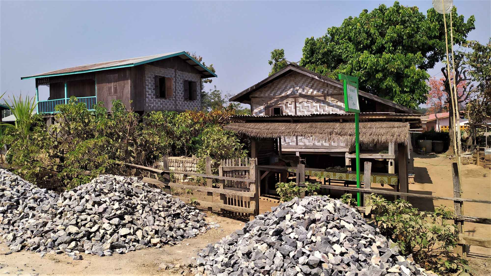 Mniej więcej w połowie drogi pomiędzy Nawnghkio i Nyaungshwe mijamy wioskę jedną z wielu na tej trasie ale ta jest wyjątkowa. To taka autentyczna wioska, pełno w niej chat zbudowanych z bambusa i stojących na palach. Wioska jest tak klimatyczna, że postanawiamy się zatrzymać na lunch. Tym razem jednak bariera językowa i zarówno nieśmiałość nasza oraz miejscowych wzięła górę. Nie udało nam się zjeść lunchu w tej wiosce ale za to w następnej już tak. Kiedy dojrzeliśmy smażone warzywa na talerzu od razu ruszyliśmy w kierunku chatki. Cała rodzina zaangażowała się w przygotowanie dla nas miejsca. Dostaliśmy talerz smażonek oraz zieloną herbatkę w termosie i tak w towarzystwie miejscowych minęła nam druga przerwa.