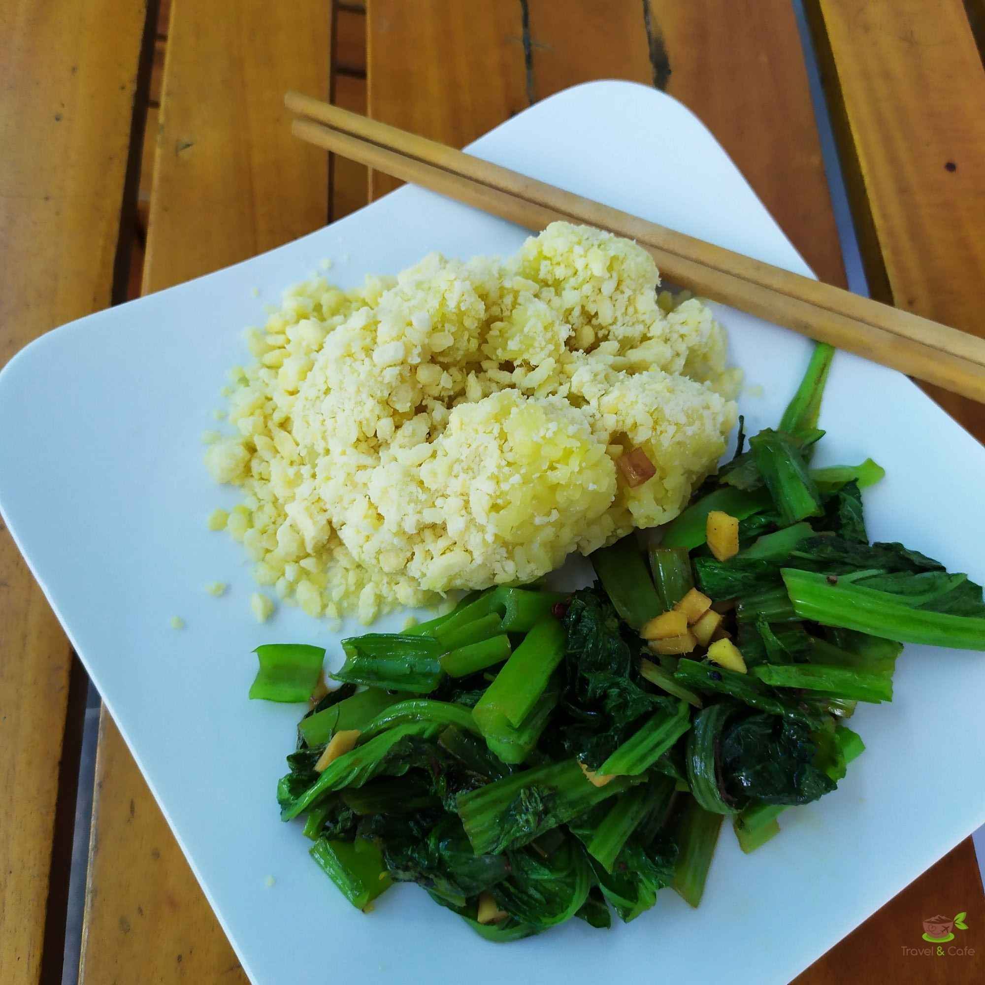 Biały kleisty ryż serwowany w wersji wytrawnej. Jednej z wielu. W tej wersji można znaleźć kleisty ryż podawany z mięsem, jajkiem, szynką. Porcja na zdjęciu została przez nas zredukowana do składników wegetariańskich. Chociaż nie zawsze taka prośba kończy się sukcesem i jakiś kawałek mięsa ląduje na talerzu ;)