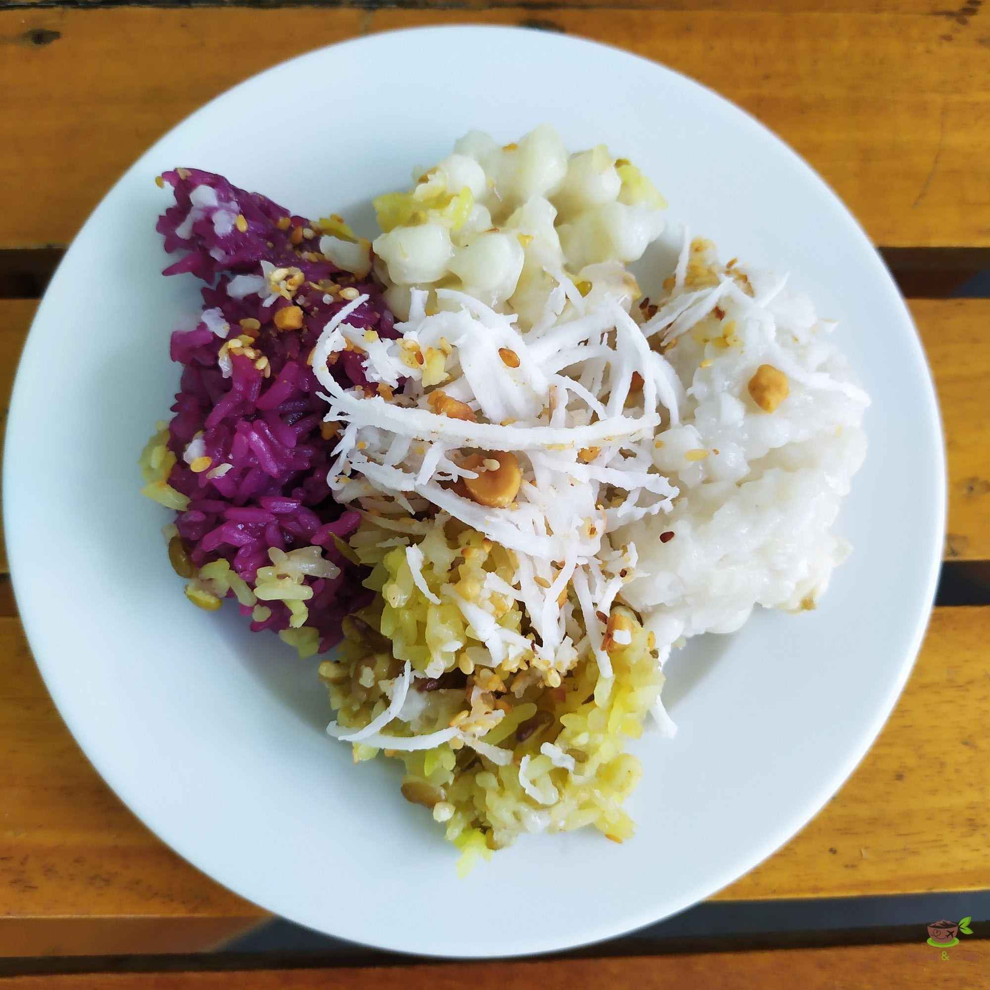 Mix dwóch odmian kleistego ryżu: fioletowego oraz żółtego z dodatkiem zielonej fasoli mung. Dwa pozostałe składniki to ziarna lotosu oraz biała kukurydza. Fioletowy ryż zawdzięcza swój kolor naturalnemu barwnikowi uzyskiwanemu z liści magenty. Całość posypana jest wiórkami kokosowymi, orzeszkami i ewentualnie cukrem. Bez cukru też jest smaczny. Taki mix można znaleźc na wyspie Phu Quoc. Codziennie na "swoim" miejscu, przy głównej drodze stoi pani ze swoim rowerem. Na bagażniku rowera ma naczynie a w nim cztery rodzaje swoich specjalności. Można kupić mix wszystkich lub dowolnie wybranych wyrobów albo tylko jeden rodzaj. Najlepiej spróbować wszystkich.