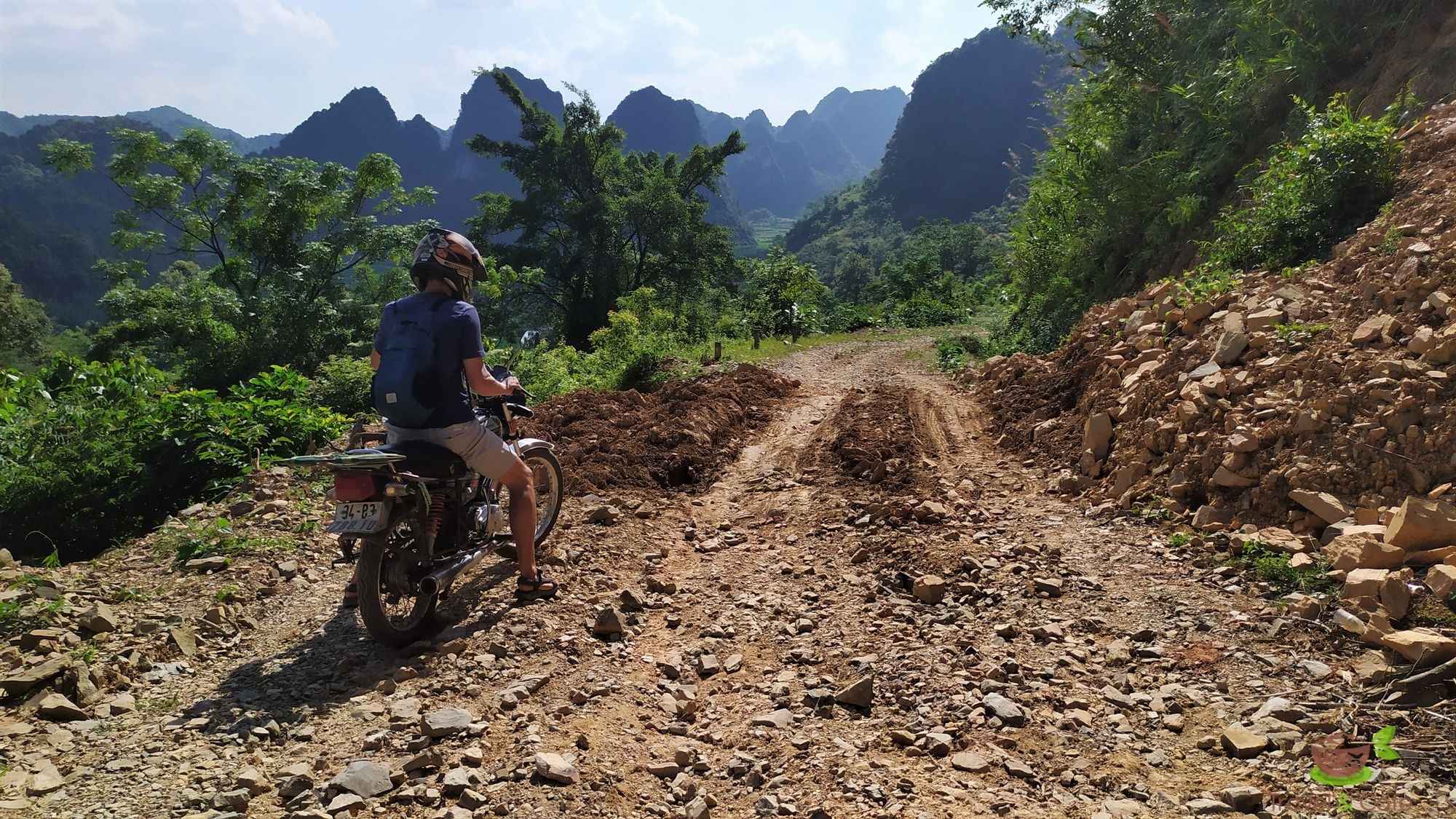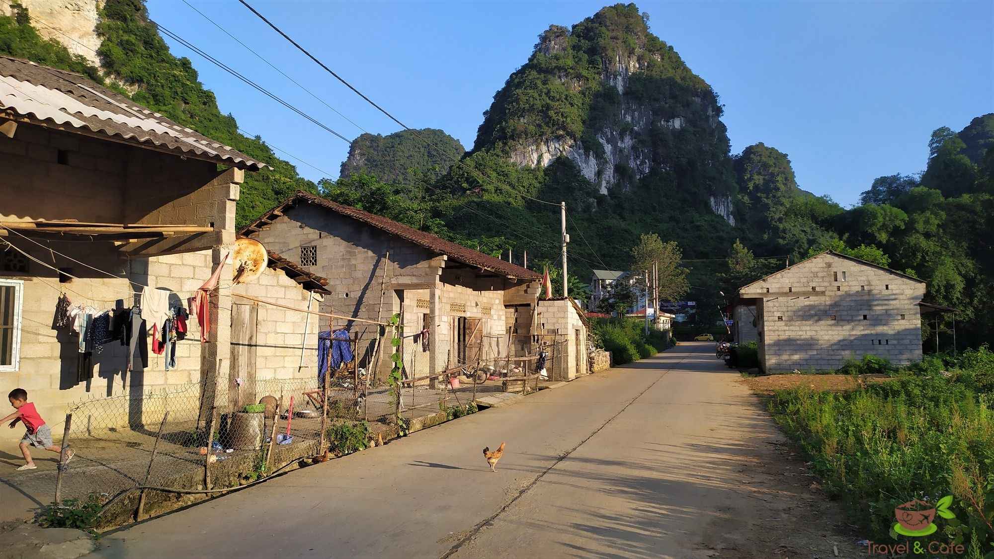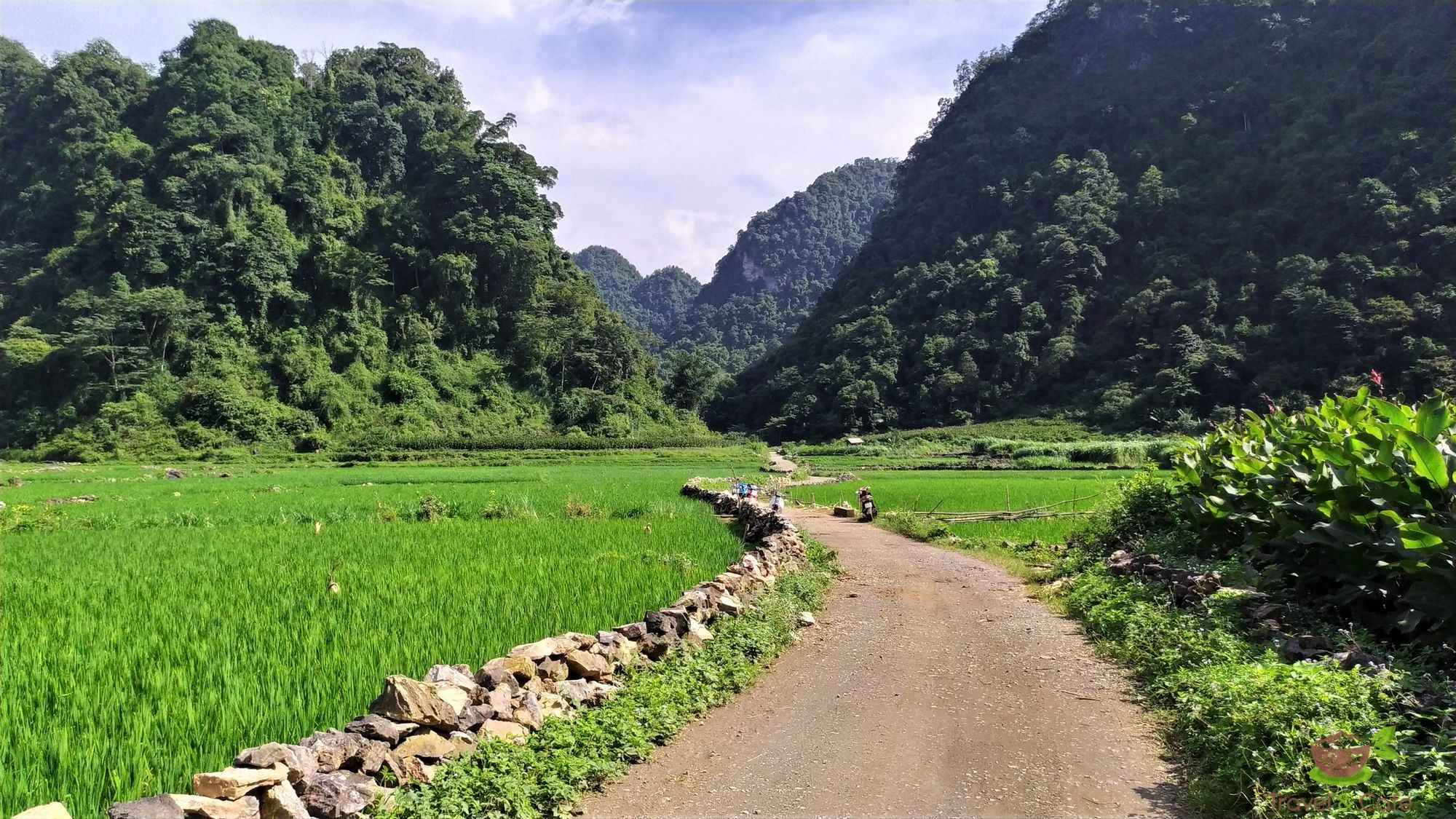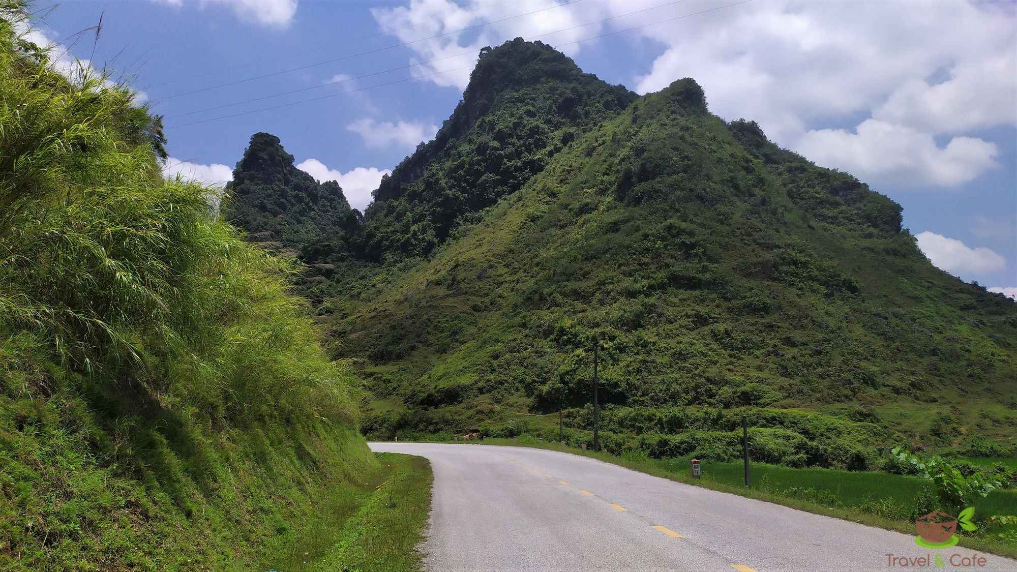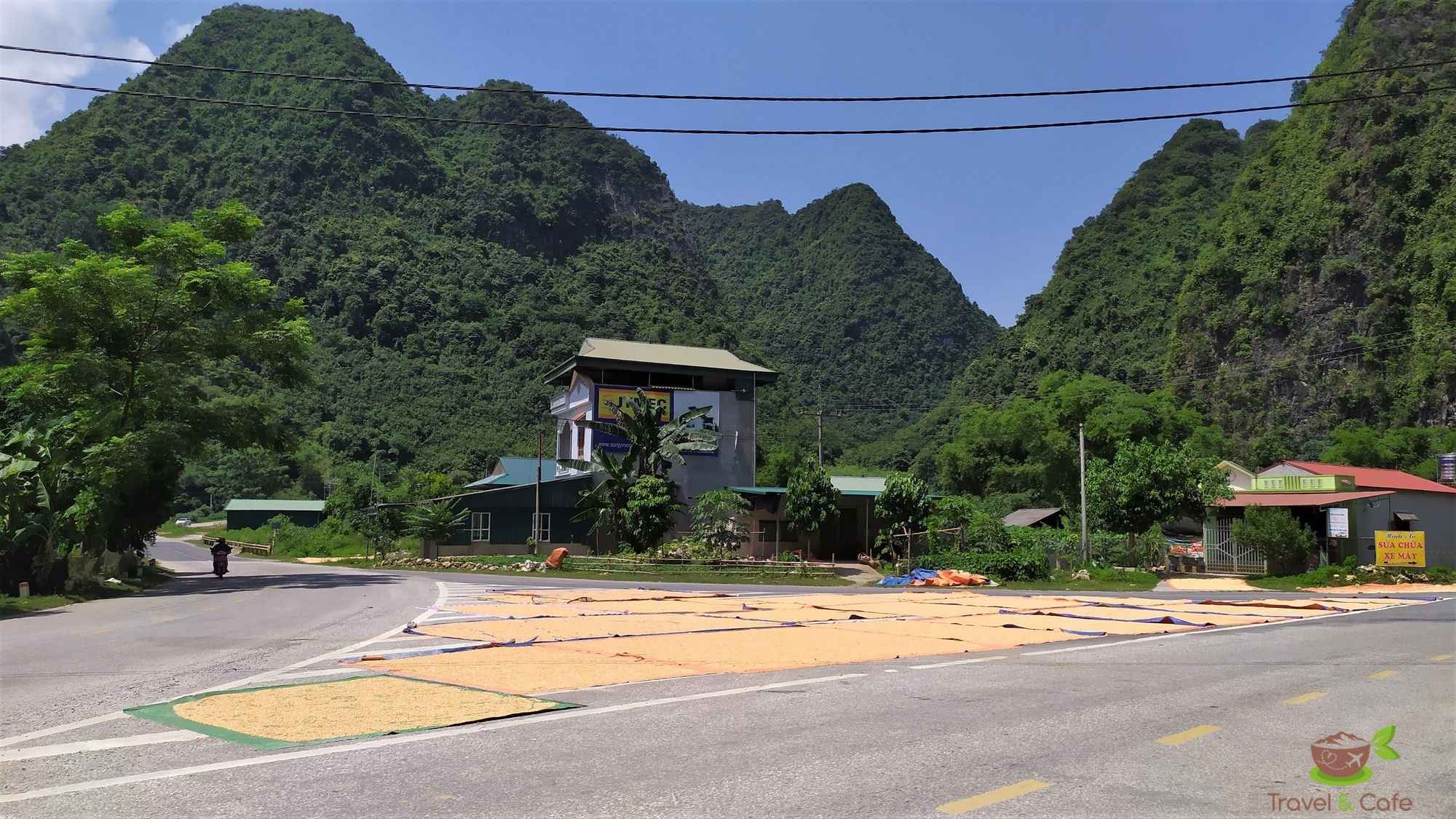 Po ostatniej przerwie ciśniemy już bezpośrednio do miejsca noclegowego. Droga wije się malowniczą doliną otoczoną wapiennymi górami, kukurydzianymi i ryżowymi polami. Wjeżdżamy pod górkę aby po chwili z niej zjechać. Słońce rozświetla skały, a różne odcienie zieleni mienią się w oczach. Jezdnia jest w dobrym stanie. Wybrany przez nas Nguom Ngao Ban Gioc Homestay znajduje się w "Kamiennej wiosce".