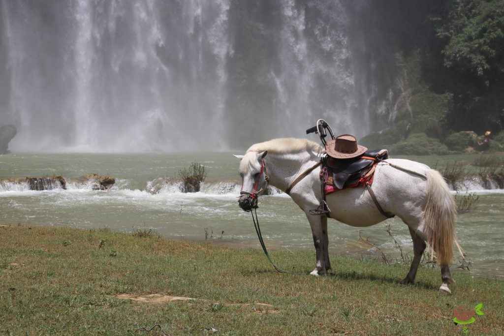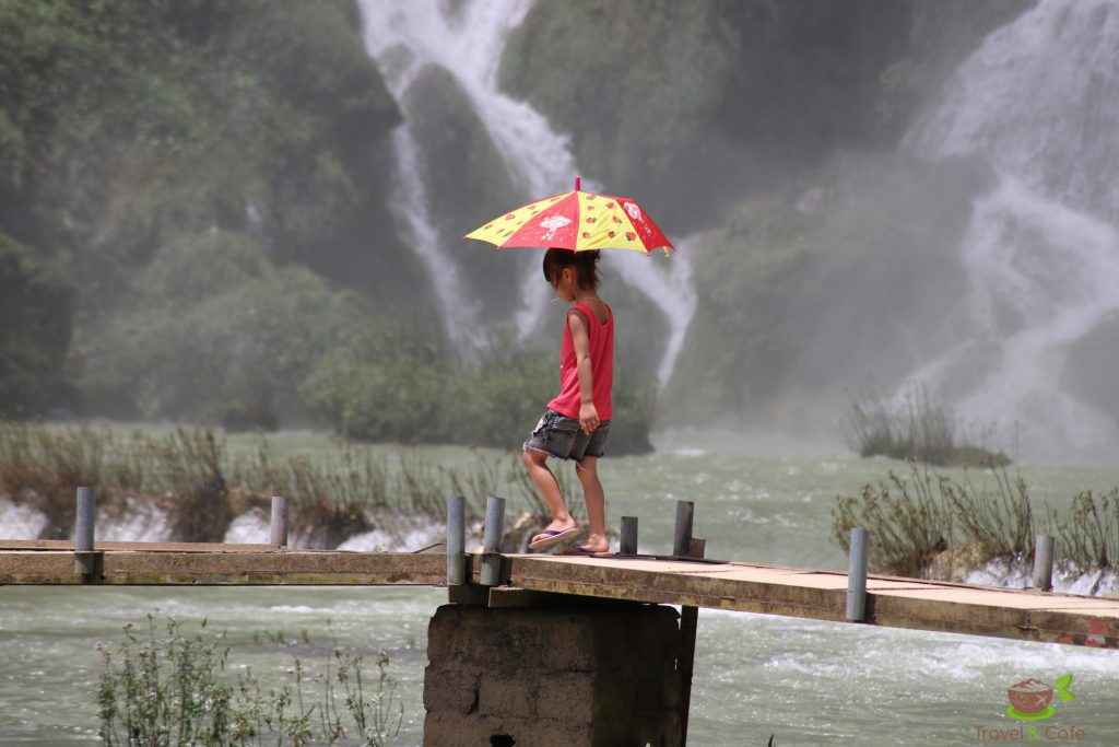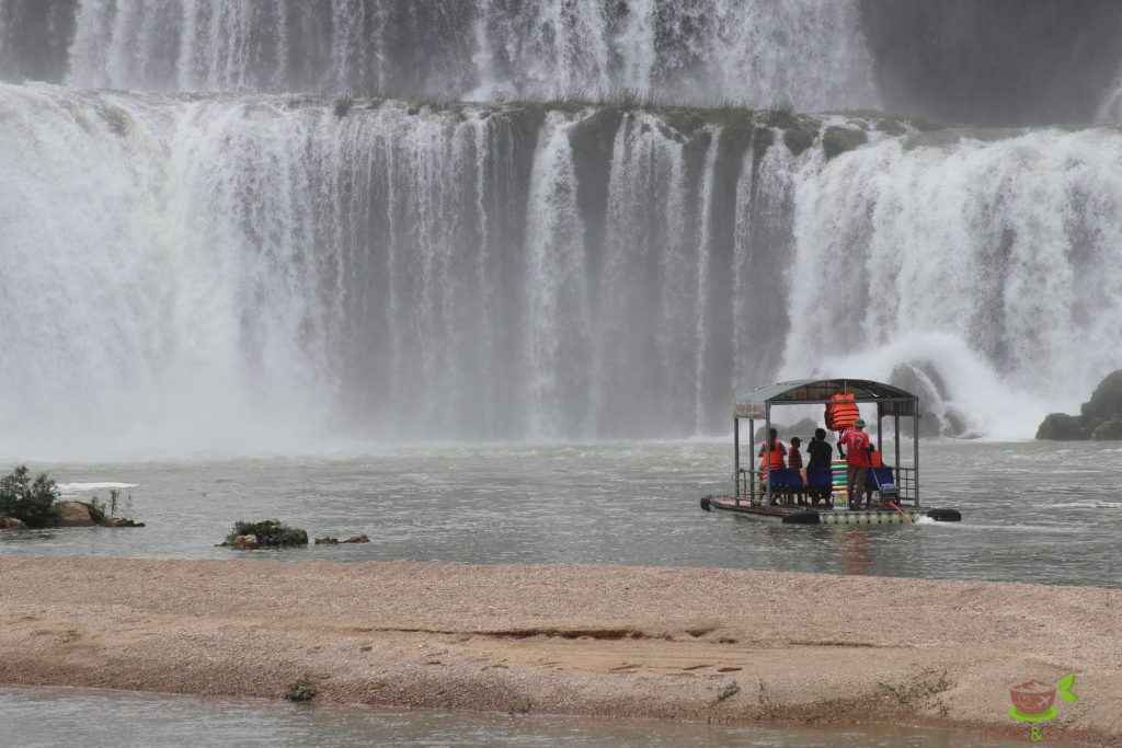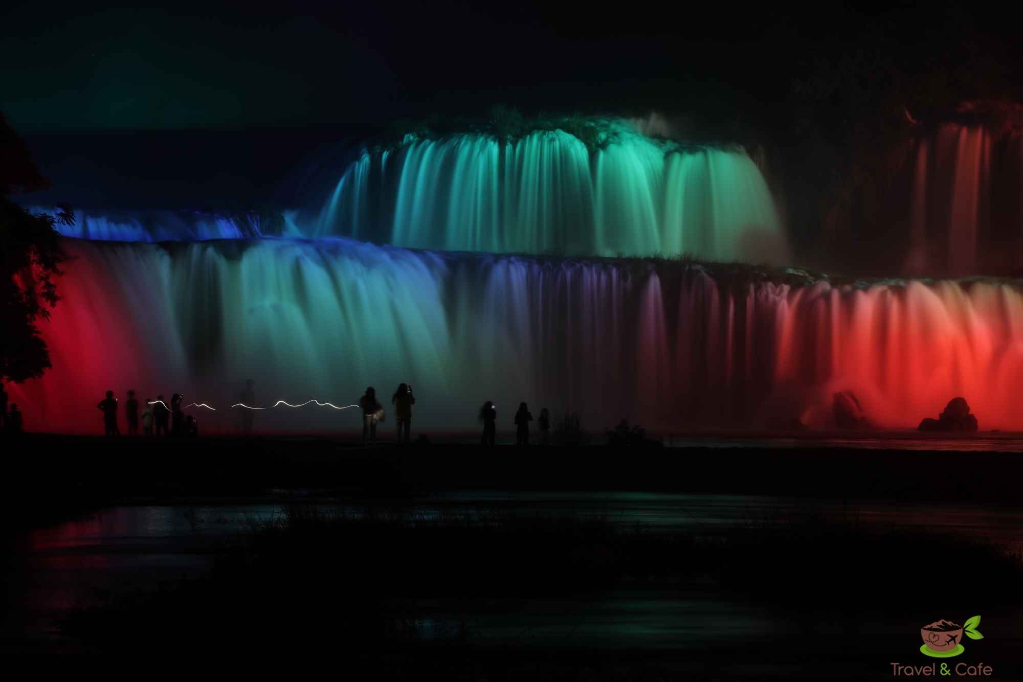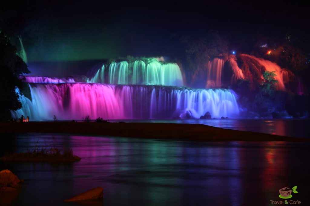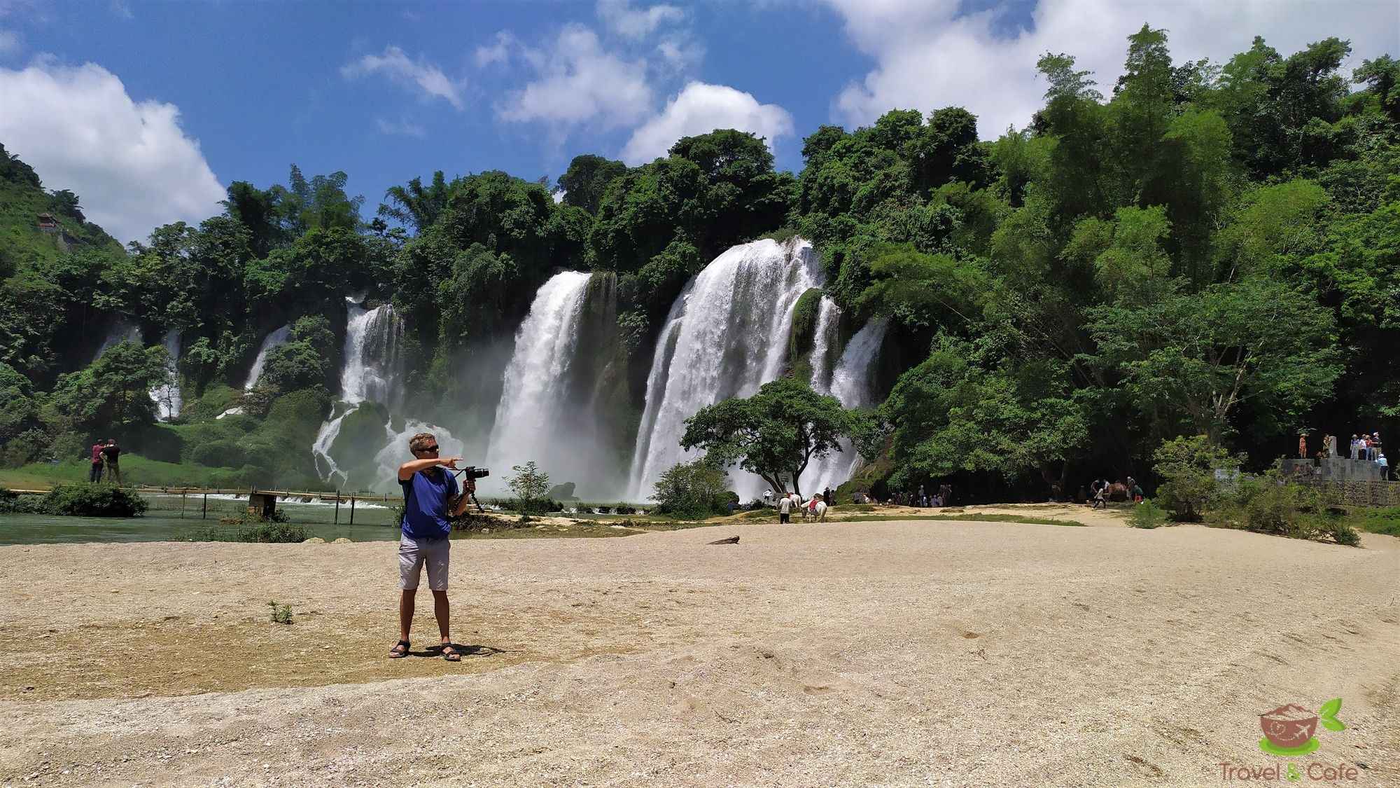 Pierwsze spojrzenie z góry wywołuje lekkie rozczarowanie. Pięknie rozświetlone wzgórze po chińskiej stronie w świetle dnia nie budzi aż takiego zachwytu jak w nocy. Przekonujemy się po raz kolejny co można osiągnąć dzięki dobrej iluminacji świetlnej. Wodospad natomiast prezentuje się majestatycznie na tle krasowego wzgórza porośniętego gigantycznymi bambusami i zieloną dżunglą. Jest rozległy. Ma 300 metrów szerokości i 35 metrów wysokości i składa się z kilku poziomów. Ban Gioc to czwarty największy wodospad na świecie położony na granicy. To naturalna granica pomiędzy Wietnamem a Chinami.