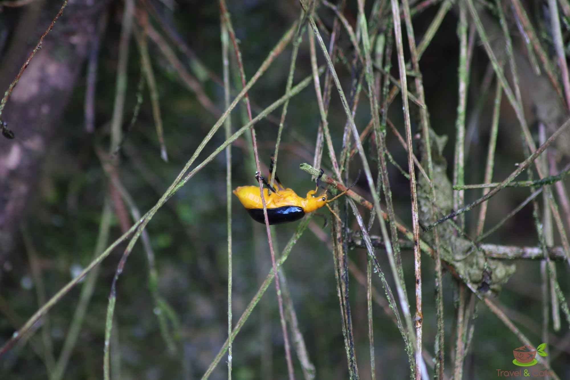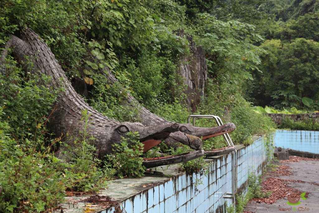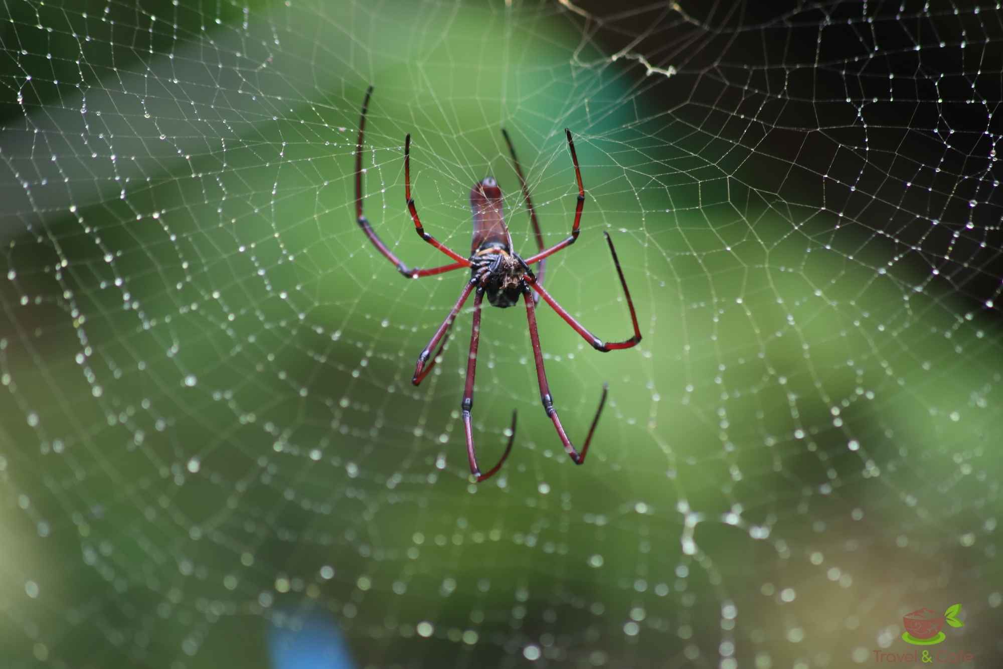 Jedziemy wąską dróżką wokół, której znajduje się kilka domów. Podjeżdżamy pod bramę. Pan z budki już do nas macha biletami. Płacimy 30 000 VND od osoby, wjeżdżamy na teren resortu i zostawiamy Asjatkę na parkingu. Rozglądamy się. Niedaleko biwakuje kilka osób. Jezioro otoczone górami wyłania się zza drzew. Z lewej jego strony jest ścieżka. Bez wahania ruszamy ścieżką w dół. Dokąd prowadzi? Do punktu z ławkami, który jest naprzeciwko. Jest sielankowo, cicho. Motyle fruwają, koniki polne skaczą, pająk czuwa w sieci. Widok jak z obrazka. Różne odcienie zieleni mienią się w promieniach słońca. Grota wydrążona w skale budzi ciekawość. To miejsce do kontemplacji, gdzie można by spędzić pół dnia. Po prostu siedząc i ciesząc oko pięknem natury. I tak też robimy. Tym razem ja siedzę i obserwuję, a Sebastian biega z aparatem i stara się uchwycić swoim obiektywem niezwykłe latające okazy.