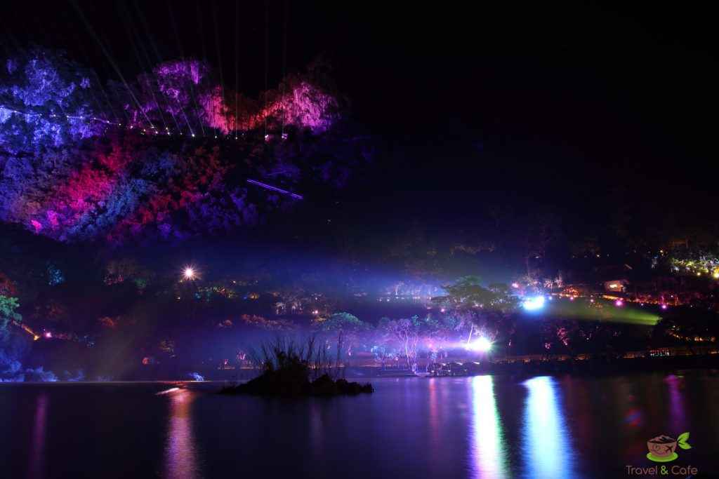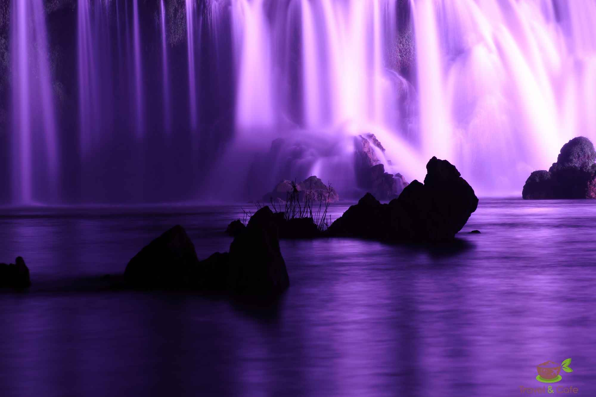 Po kolacji wskakujemy na motocykl i jedziemy nad wodospad. Im bliżej celu tym bardziej kolorowo. Lasery rozświetlają ciemne niebo nad granicą. Skręcamy z głównej drogi w lewo. Po godzinie 17:00 wstęp jest bezpłatny. Wodospad mieni się kolorami, wzgórze też. Cała wioska po chińskiej stronie to spektakl kolorów i animacji. Przepięknie zaaranżowane oświetlenie RGB, sterowane cyfrowo. Szum wodospadu i muzyka uzupełniają ten kolorowy świat. Zachwycamy się bajkowym krajobrazem ponad dwie godziny. Sebastian oddaje się sztuce fotografii czego efekty możecie zobaczyć w galerii :))