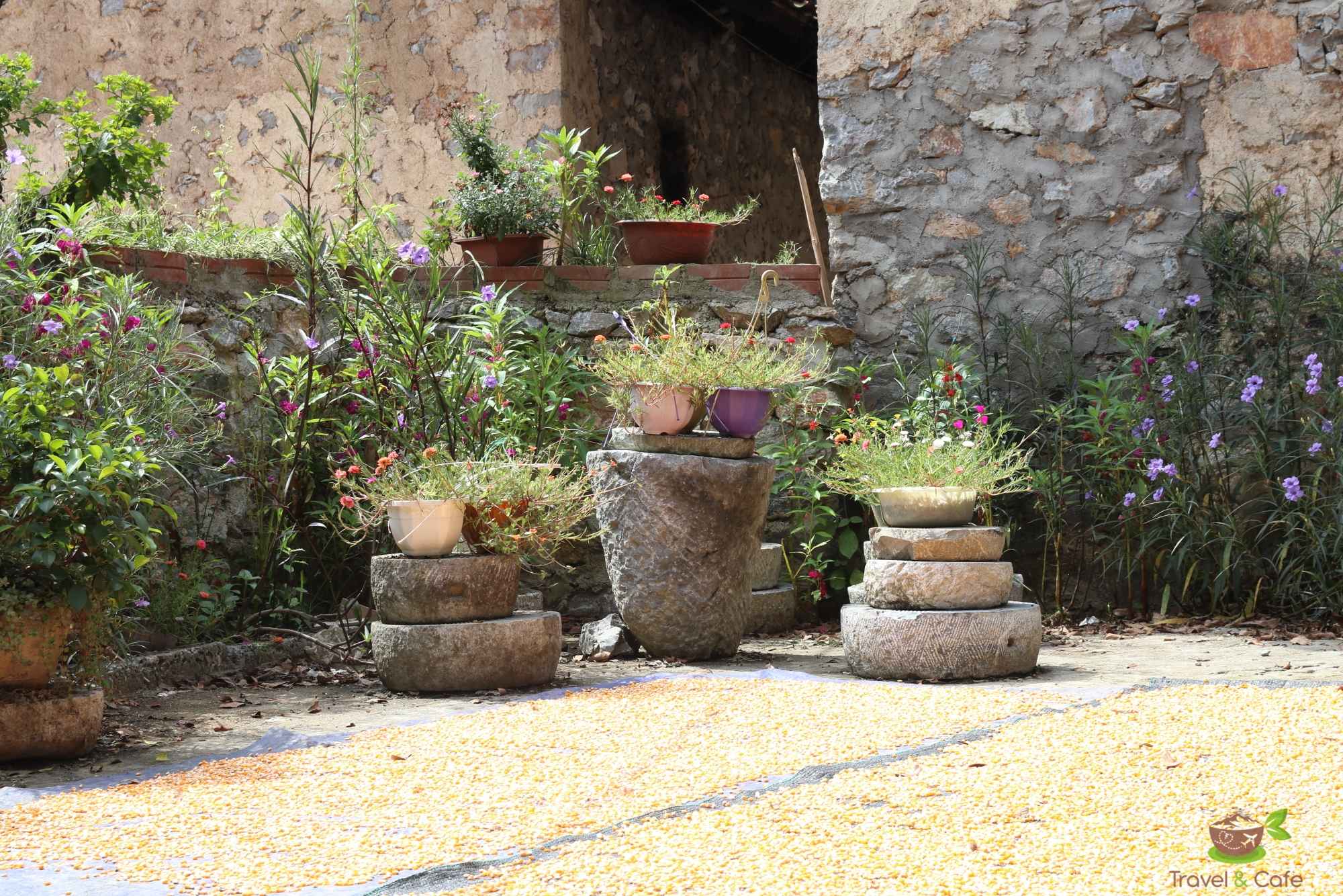 Jeszcze nam mało. No to może zrobimy pętelkę? Pętelkę zrobiliśmy ale nie polecamy, chyba, że macie odpowiedni motocykl. W miejscowości Quang Uyen skręcamy w lewo. Początkowo droga numer DT207 jest w dobrym stanie. Na skrzyżowaniu suszy się kukurydza. Na rzece można znaleźć kilka młynów wodnych. Ale mniej więcej po 18 km ta sielanka się kończy i jest tylko gorzej. Droga pnie się w górę i jest w tragicznym stanie. Co tu robić? Skręćmy w lewo… padła propozycja. Skręciliśmy i przez część trasy idę pieszo... Po wystających kamieniach po prostu nie da się jechać w dwójkę na motocyklu. Poza tym szkoda nam naszej Asjatki. Mam więc i spacer i przejażdżkę w jednym. Wyjeżdżamy w wiosce Thong Hue. Trasa jest niezwykle malownicza ale myślę, że nie warto narażać motocykla na szkody, które mogą wyniknąć z jazdy po dziurach i kamieniach.