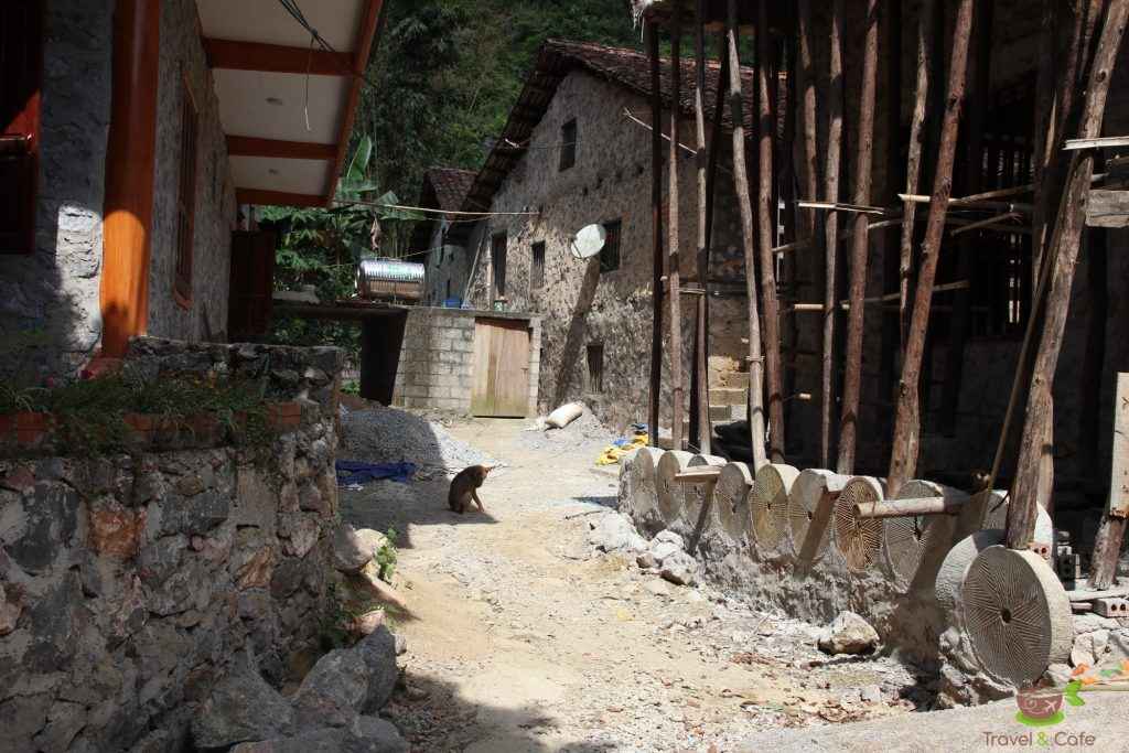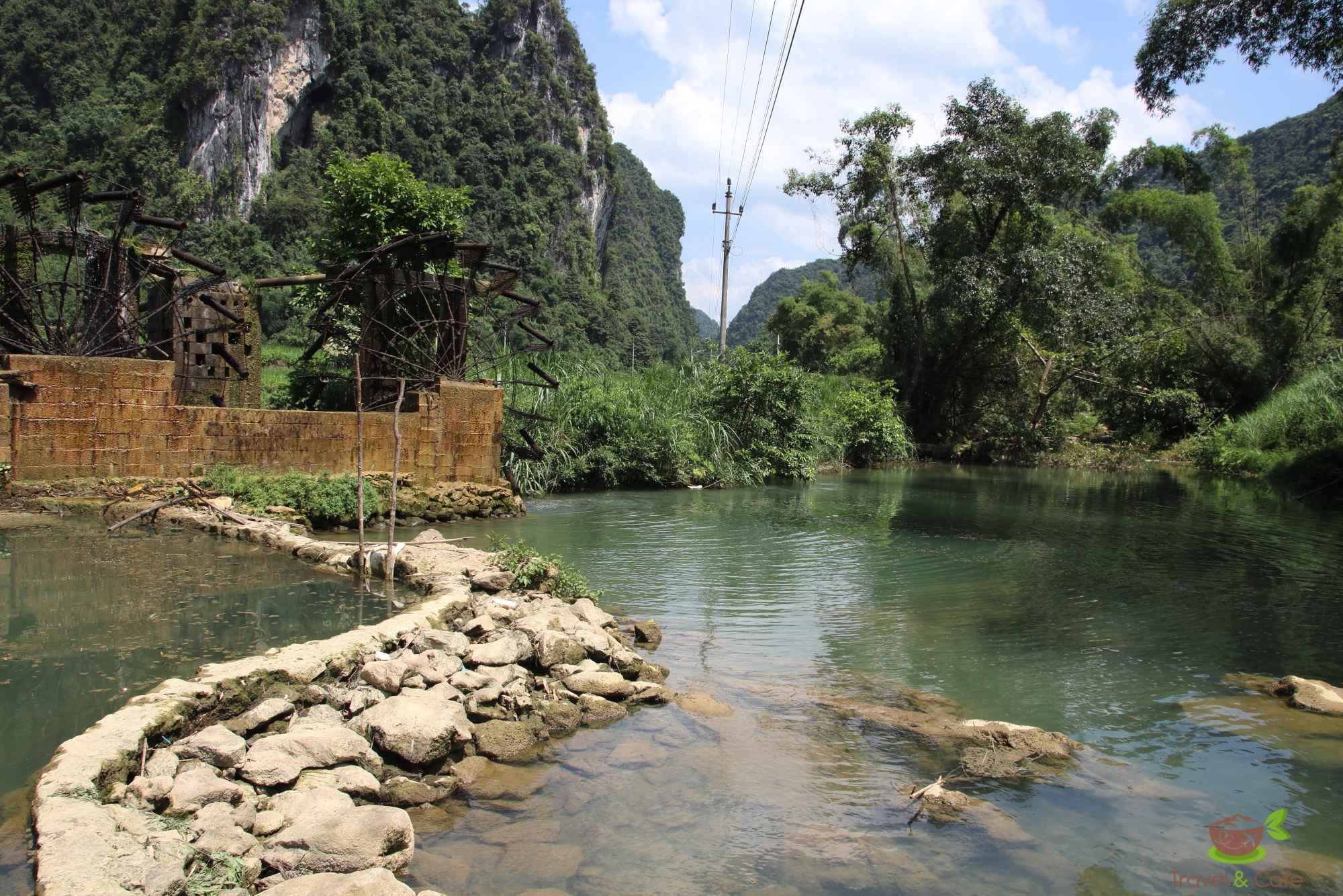 Kiedy już nasyciliśmy się widokiem na wodospad w dzień i w nocy, z góry i z dołu przyszedł czas na odnalezienie młynów wodnych. Okolica bowiem słynie również z większych i mniejszych, kręcących się drewnianych kół, rozlokowanych na rzece Quay Son. Tylko gdzie one są? Najtrudniej znaleźć ten pierwszy. Wypatruję. Jest jeden do którego można podejść, potem drugi po przeciwległej stronie rzeki i kiedy przejeżdżamy przez most i wjeżdżamy do wioski, widzimy trzeci mniejszy. „Wieczne maszyny” pracują dzień i w nocy dostarczając wodę do wioski i na pola. Młyny wodne są wykonane z naturalnych materiałów i wskazują na ogromną kreatywność miejscowej ludności w wykorzystaniu przyrody w codziennym życiu. Są również unikalnym symbolem grup etnicznych zamieszkujących prowincję Cao Bang.